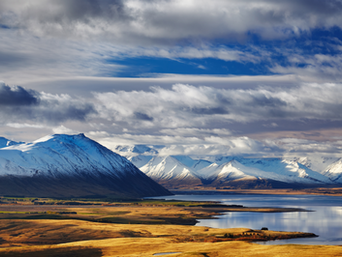 Arrive at Lake Tekapo, framed by Southern Alps.